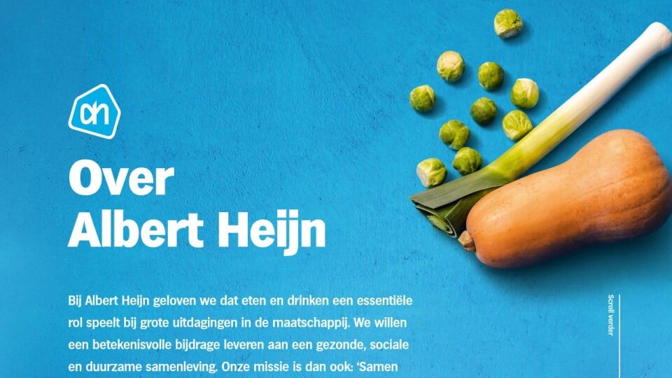Bij Albert Heijn geloven we dat eten en drinken een essentiële rol speelt bij grote uitdagingen in de maatschappij. We willen een betekenisvolle bijdrage leveren aan een gezonde, sociale en duurzame samenleving. Onze missie is dan ook: ‘Samen beter eten bereikbaar maken. Voor iedereen.’.