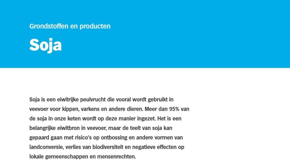 Soja is een eiwitrijke peulvrucht die vooral wordt gebruikt in veevoer voor kippen, varkens en andere dieren. Meer dan 95% van de soja in onze keten wordt op deze manier ingezet. Het is een belangrijke eiwitbron in veevoer, maar de teelt van soja kan gepaard gaan met risico’s op ontbossing en andere vormen van landconversie, verlies van biodiversiteit en negatieve effecten op lokale gemeenschappen en mensenrechten.