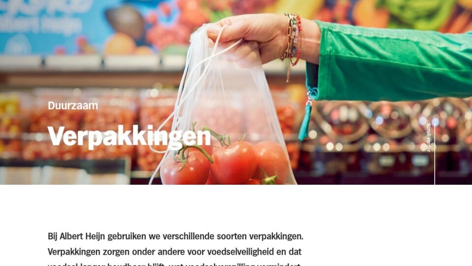Bij Albert Heijn gebruiken we verschillende soorten verpakkingen. Verpakkingen zorgen onder andere voor voedselveiligheid en dat voedsel langer houdbaar blijft, wat voedselverspilling vermindert. Verpakkingen bieden dus veel voordelen, maar ze hebben ook invloed op het milieu. Daarom zijn we altijd op zoek naar slimme en creatieve oplossingen om onze verpakkingen te verduurzamen.